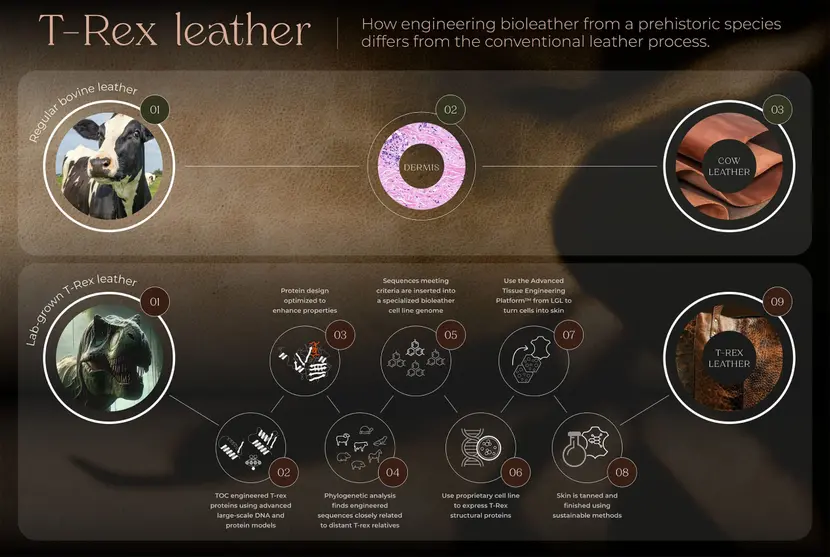 El proceso consiste en la manipulación de células con ADN sintético del T. rex por parte de The Organoid Company, que serán cultivadas en laboratorio y estructuradas sin andamios por Lab-Grown Leather Ltd. Este enfoque permite que las propias células formen su estructura, imitando la textura y resistencia del cuero tradicional.