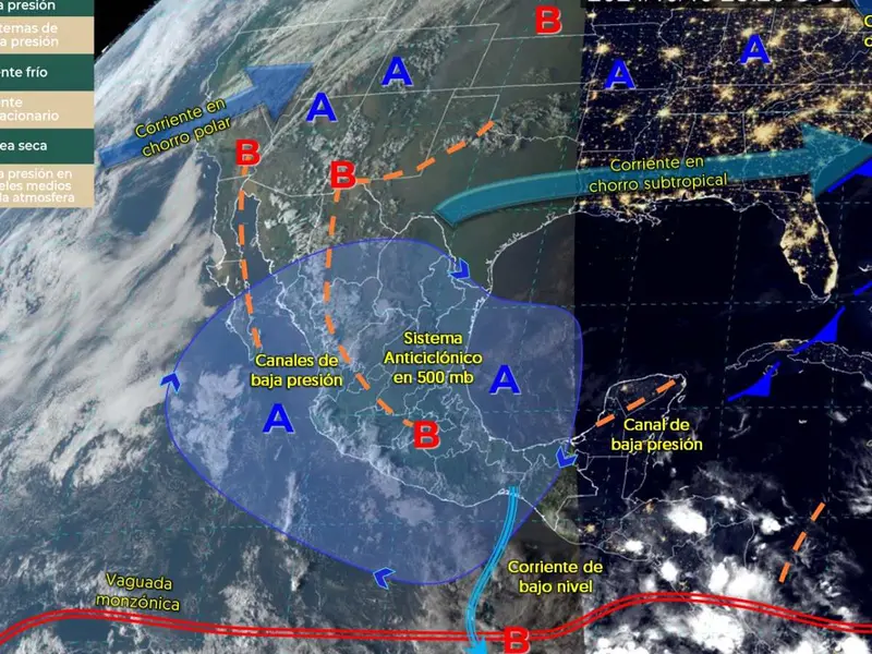 - Otro canal de baja presión sobre el Golfo de México y la Península de Yucatán, en interacción con la humedad, producirá lluvias intensas en el sur y sureste del país, con precipitaciones fuertes en Veracruz, Tabasco y Chiapas.