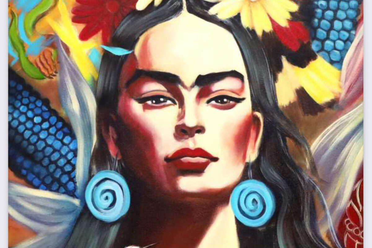 Símbolos de identidad mexicana en un retrato inspirado en Frida Kahlo.