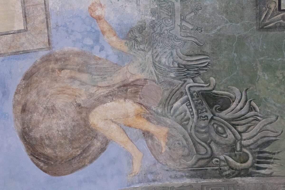 Representación del Árbol de Tamoanchan acompañada por la figura de Quetzalcóatl, en una de las secciones intervenidas del mural de Tarazona. La iconografía está basada en fuentes históricas como Historia general de la Nueva España, de Sahagún.
