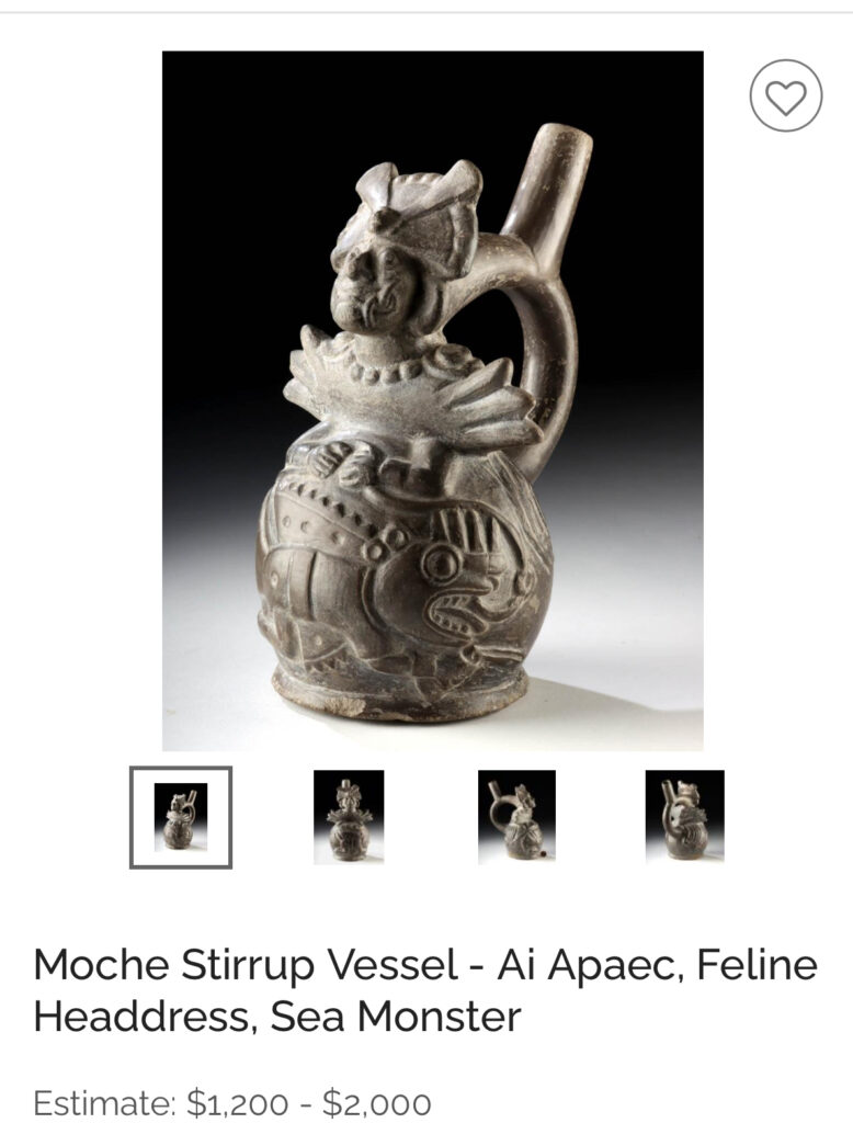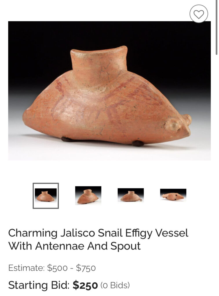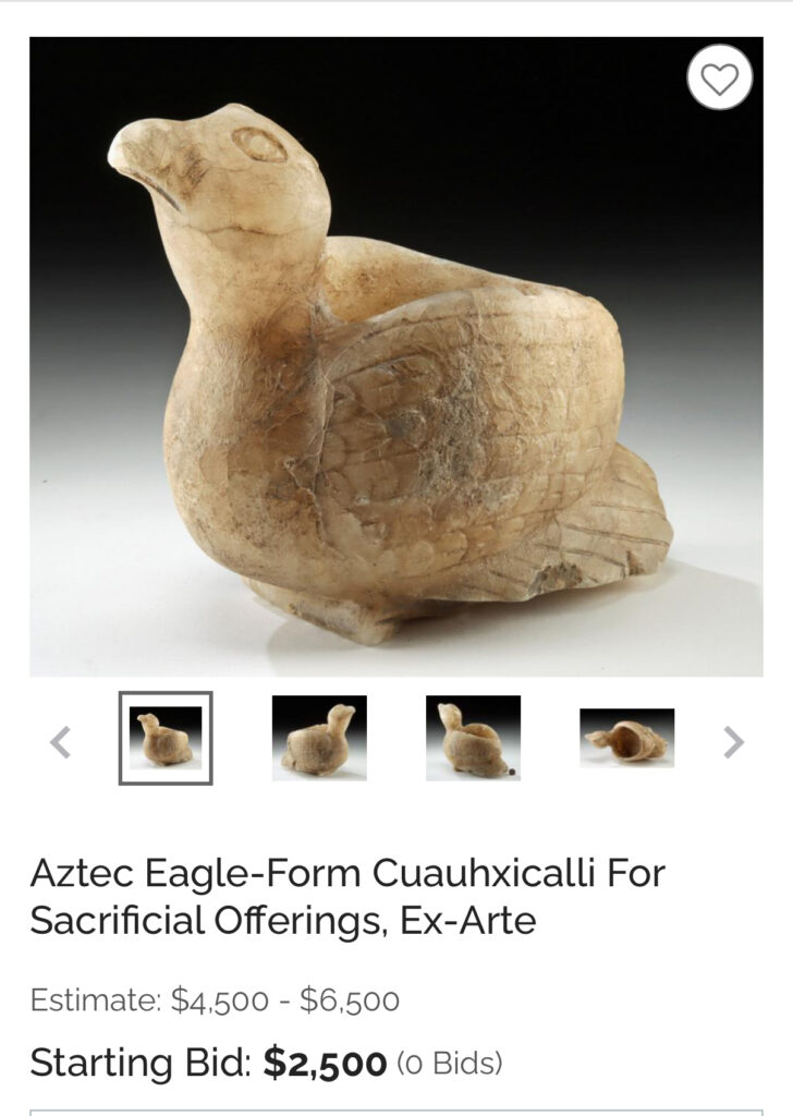 Un cuauhxicalli azteca en forma de águila y una vasija en forma de caracol, atribuidas a culturas mesoamericanas, aparecen en el catálogo de la subasta de Artemis Gallery en Colorado; ambos objetos fueron identificados por el INAH como parte del patrimonio cultural de México.