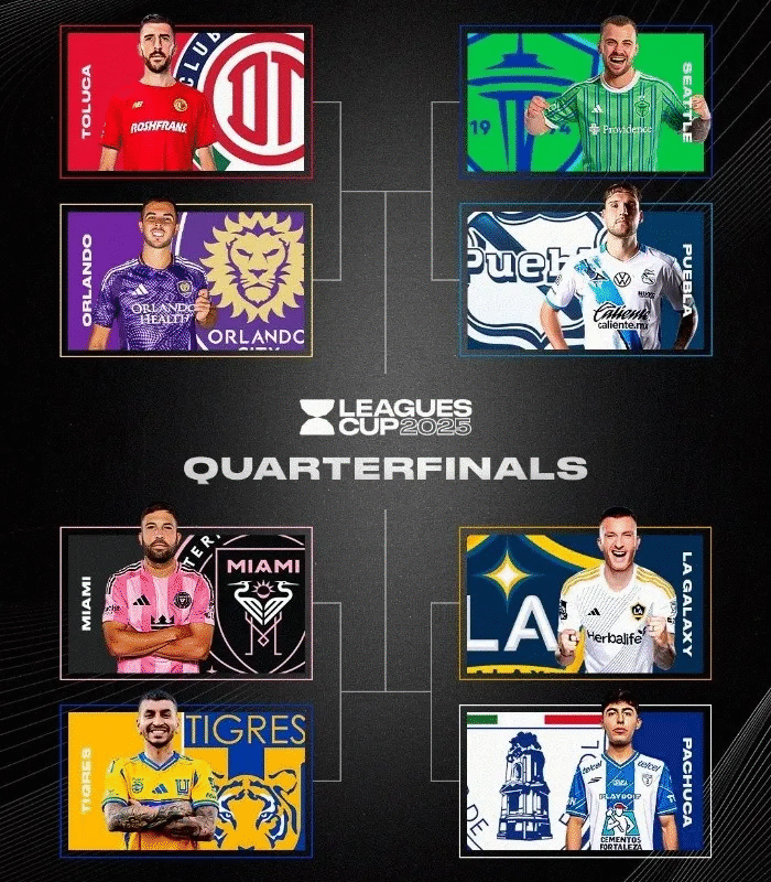 Quedaron definidos los Cuartos de Final de la Leagues Cup 2025, etapa en la que Tigres, Toluca, Puebla y Pachuca representan a la Liga MX en busca del título y de uno de los tres boletos disponibles para la Concachampions 2026.