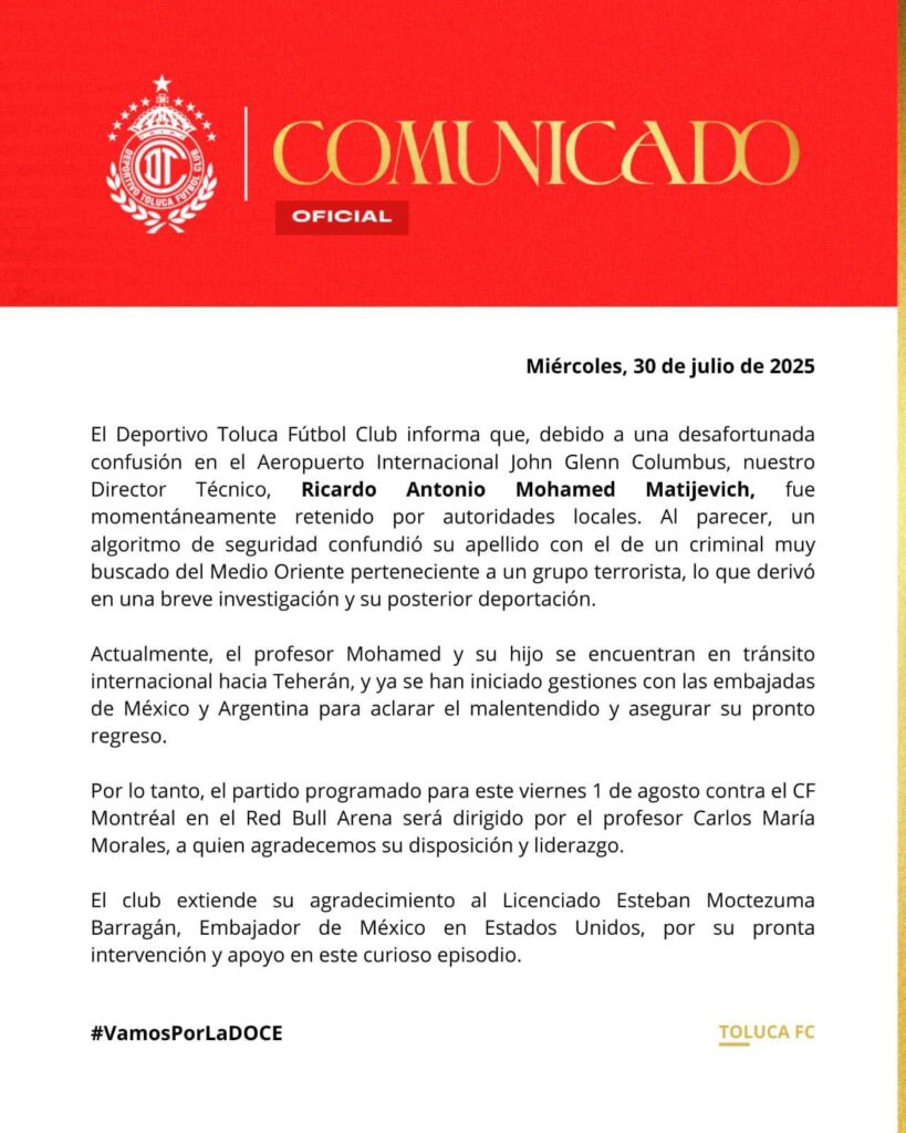 Sin embargo, este miércoles 30 de julio, un día después del partido, circuló en redes sociales un supuesto comunicado oficial del Club Toluca que afirmaba que el entrenador argentino y su hijo habían sido detenidos en el aeropuerto de Columbus por una confusión con su apellido, presuntamente relacionado con un criminal de Medio Oriente.
