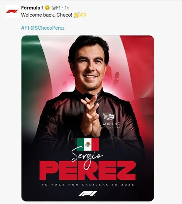 La Fórmula 1 abrió los brazos de nuevo a Sergio ‘Checo’ Pérez, quien volverá a la parrilla en 2026 como piloto de la flamante escudería Cadillac Racing. A través de sus redes sociales, la organización le dedicó un mensaje especial que conmovió a la afición mexicana: