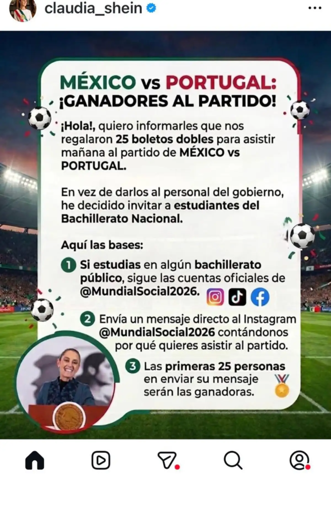 La presidenta de México, Claudia Sheinbaum, anunció que regalará 25 boletos dobles a estudiantes de bachillerato público para asistir al partido entre México y Portugal, programado para este sábado en el Estadio Azteca.