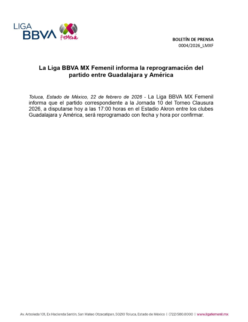 Por su parte, la Liga de Expansión señaló que el encuentro de la jornada 7 del Clausura 2026, previsto a las 16:00 horas en el Estadio Gregorio ‘Tepa’ Gómez, entre Tapatío y Tlaxcala, será reprogramado para el lunes 23 de febrero de 2026, en horario por confirmar.