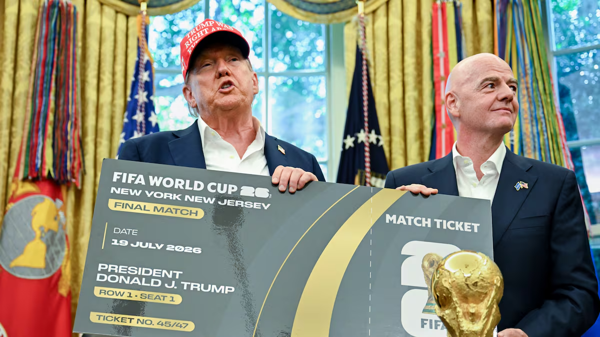 El presidente de Estados Unidos, Donald Trump, sujeta en el Despacho Oval una réplica de una de las entradas del Mundial de 2026.