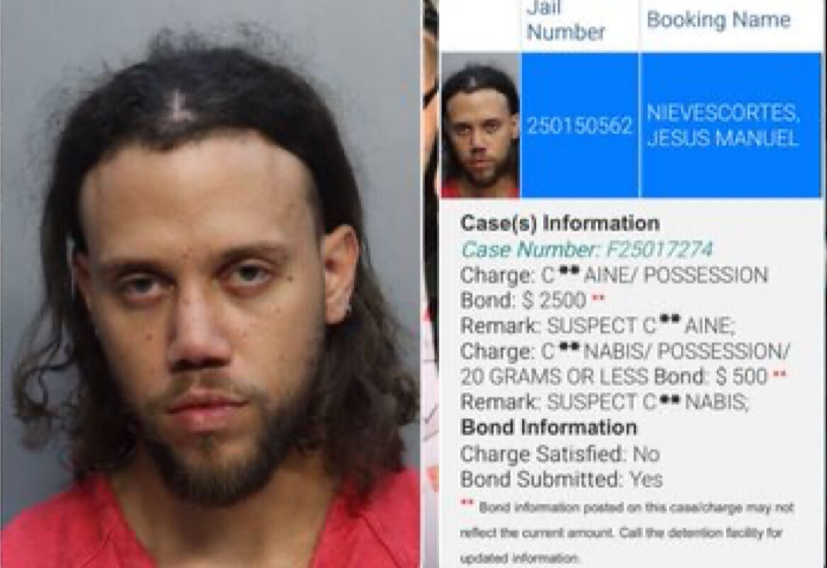 El operativo ocurrió en la zona de SW 8 Street, cuando agentes se acercaron a su Corvette rojo detenido en plena vía. Según el reporte, los oficiales detectaron olor a cannabis y observaron residuos de polvo blanco en su ropa. Tras la revisión, incautaron tres envoltorios con presunta cocaína y dos bolsas con marihuana.