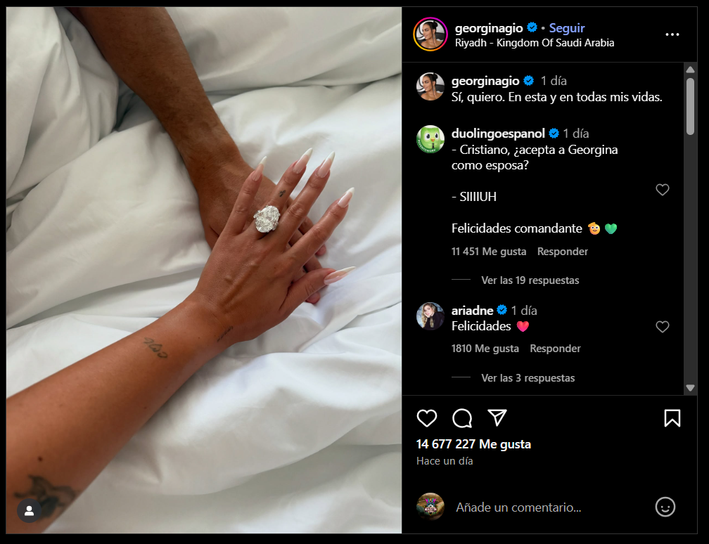 En una publicación en Instagram, Georgina compartió una imagen en la que luce la pieza en su mano izquierda. La fotografía, que rápidamente se volvió viral, acumuló más de 12 millones de “me gusta” y miles de mensajes de felicitación de seguidores y celebridades en cuestión de horas.