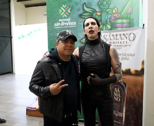 El gobernador Ricardo Gallardo, vestido de negro, posa con Marilyn Manson antes del concierto en la FENAPO 2025.