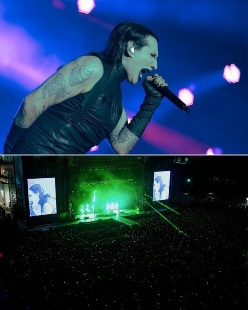 La escenografía incluyó cruces de Lorena invertidas, telones negros, proyecciones inquietantes y un juego de luces que bañaba el escenario en tonos rojos, púrpuras y azules. El ambiente oscilaba entre lo ceremonial y lo provocador, mientras Manson se movía con lentitud calculada, midiendo cada pausa y cada gesto.