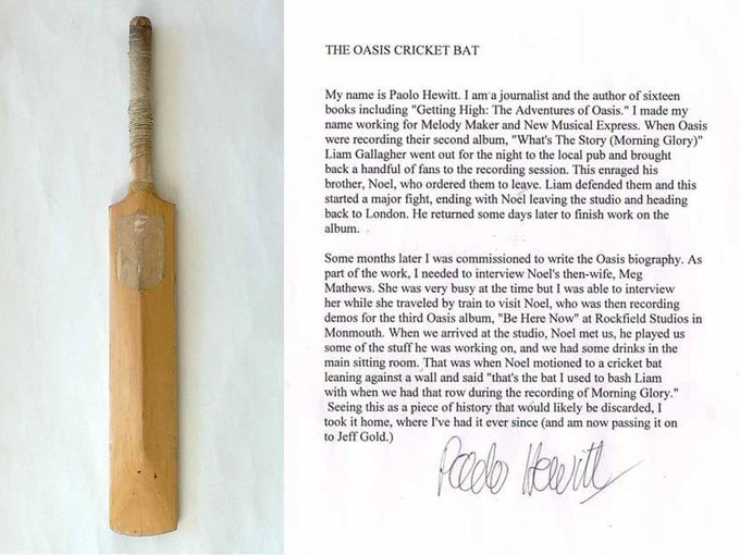 Durante la grabación de su segundo álbum What’s The Story Morning Glory en Gales, Liam llevó a varios amigos al estudio, interrumpiendo el trabajo de Noel. Molesto, Noel lo golpeó en la cabeza con un bate de cricket, que luego fue subastado.