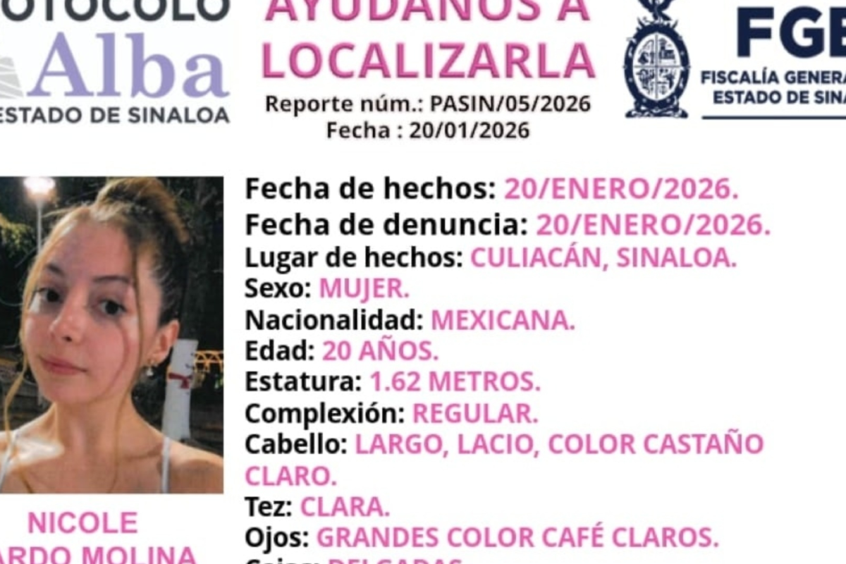 Según la ficha de búsqueda, Nicole Pardo fue vista por última vez en un domicilio del fraccionamiento Isla Musalá, zona residencial y comercial ubicada al oriente de la capital sinaloense. La denuncia por su desaparición fue presentada el mismo día de los hechos y, hasta el momento, no se ha informado sobre su localización.