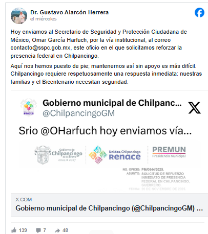 El alcalde Gustavo Alarcón solicitó al Gobierno Federal un reforzamiento permanente de seguridad en Chilpancingo, debido al incremento de hechos violentos y la cercanía de las festividades de diciembre.