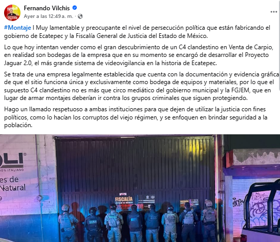 El exalcalde y actual diputado del PT, Fernando Vilchis, reaccionó al operativo asegurando que no se trata de un centro clandestino, sino de una bodega vinculada al Proyecto Jaguar 2.0, la estrategia de seguridad implementada en su administración. “Es una empresa legalmente establecida que funciona como almacén de equipos y materiales. Este montaje es un circo mediático”, afirmó en redes sociales.