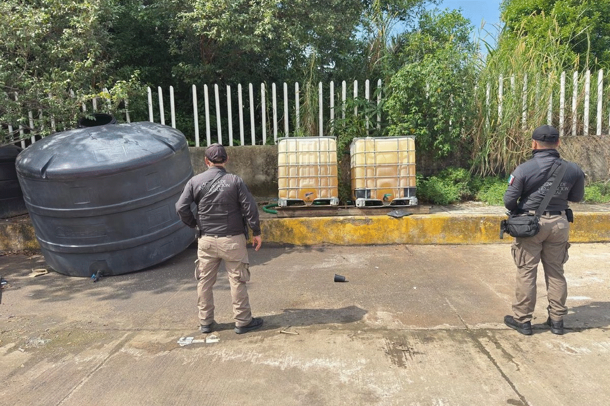 La Fiscalía General de la República aseguró combustible, vehículos e infraestructura en un inmueble de Villa Allende, Coatzacoalcos, durante un cateo autorizado por un juez de Control.