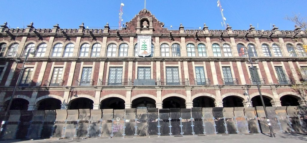 Durante la madrugada, trabajadores instalaron bloques de acero para formar una valla perimetral alrededor del Palacio de Gobierno de Morelos con el objetivo de proteger el inmueble ante la marcha programada para el 8 de marzo.