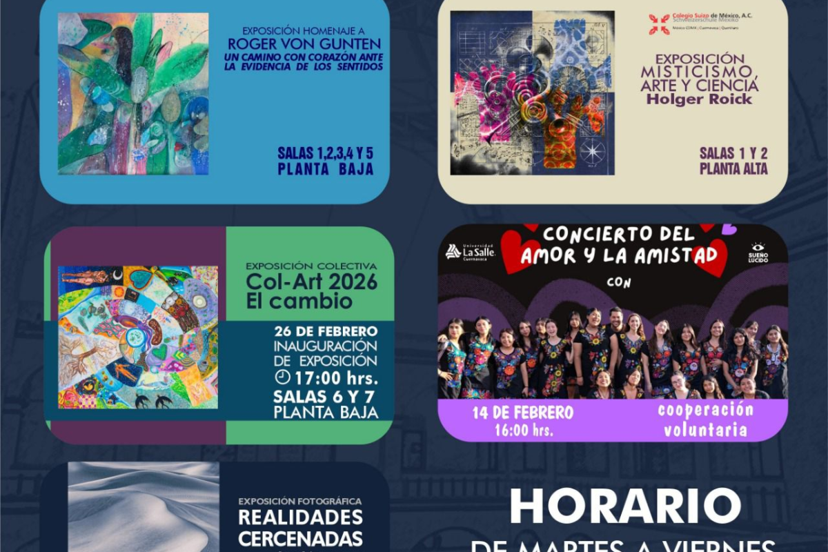 Entre los eventos programados se encuentra el Concierto del Amor y la Amistad, previsto para el 14 de febrero a las 14:00 horas con cooperación voluntaria. También se realizará la inauguración de la exposición fotográfica “Realidades Cercenadas”, del artista Ian Lizaranzu, el 19 de febrero a las 17:00 horas en las salas 3, 4 y 5 de la planta alta.