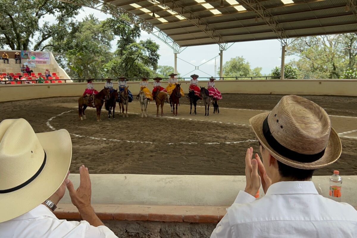 La escena fue elocuente. Lejos de los salones formales, el encuentro transcurrió en un espacio vivo, donde el espíritu comunitario y la cultura mexicana se expresaban a través de la charrería. En este caso, la competencia de escaramuzas femeniles: precisión, elegancia y fuerza sobre la arena.