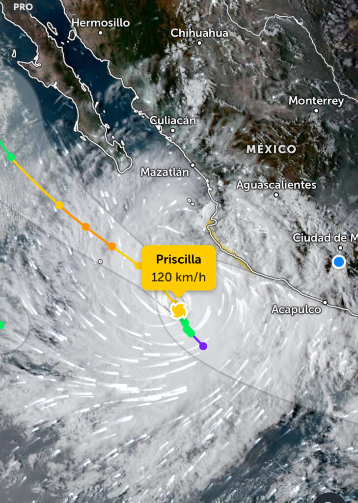 (De acuerdo con el Centro Nacional de Huracanes (NHC), Priscilla se convirtió en el décimo huracán de la temporada del Pacífico Oriental, con vientos sostenidos de 120 km/h (75 mph) y un movimiento lento hacia el noroeste, a unos 470 kilómetros del litoral mexicano. El fenómeno genera condiciones peligrosas de oleaje y corrientes marinas que podrían extenderse hasta el lunes hacia las costas del centro-occidente y sur de Baja California Sur.