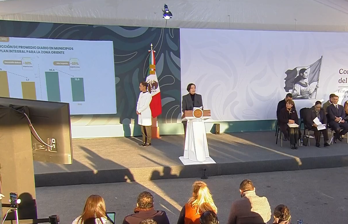 La funcionaria señaló que, como parte del Plan Integral Oriente, en 11 municipios se logró una reducción de 32% en homicidios dolosos y de 23% en delitos de alto impacto.