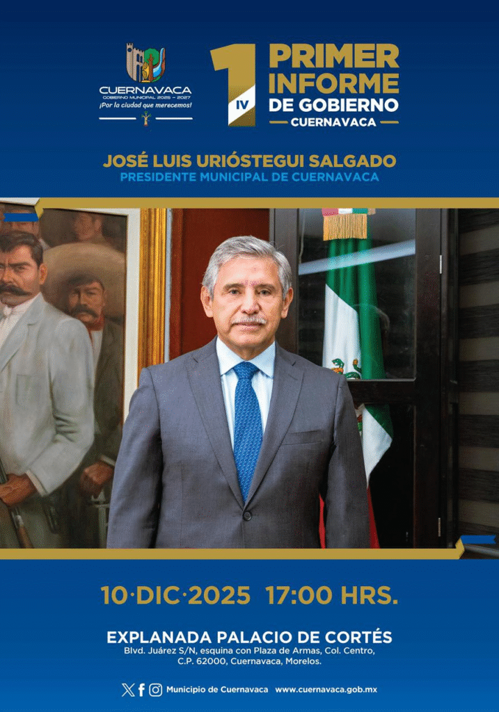 Cuernavaca, Morelos, 3 de diciembre de 2025. El presidente municipal de Cuernavaca, José Luis Urióstegui Salgado, presentará su Primer Informe de Gobierno correspondiente a su segunda administración el miércoles 10 de diciembre, en un ejercicio de transparencia y rendición de cuentas dirigido a la ciudadanía.