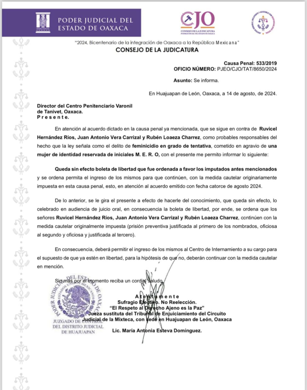 Juan Antonio Vera Carrizal, acusado de haber perpetrado el ataque con ácido en contra de la saxofonista María Elena Ríos, permanecerá en prisión, luego de que la jueza María Antonieta Esteva Domínguez, del Tribunal Superior de Justicia de Oaxaca (TSJO), anulara la boleta de libertad que había sido emitida a su favor. La resolución fue notificada al director del centro penitenciario de Tanivet a través del oficio PJEO/CJO/TAT/8650/2024, confirmando que tanto Vera Carrizal como otros dos implicados, Rubicel Hernández Ríos y Rubén Loaeza Charrez, seguirán en prisión preventiva.