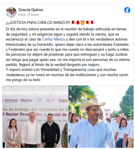 Uruapan, Michoacán, 4 de diciembre de 2025. La alcaldesa Grecia Quiroz reiteró su exigencia de justicia por el homicidio del presidente municipal independiente Carlos Manzo Rodríguez. Mediante un mensaje difundido en sus redes sociales, afirmó que continuará solicitando resultados a las autoridades estatales y federales hasta que se esclarezca el caso.