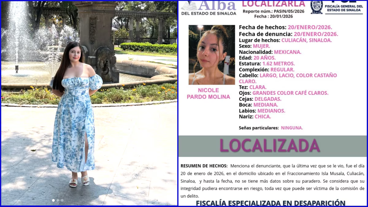 La Fiscalía de Sinaloa informó la localización con vida de Nicole Pardo Molina, creadora de contenido reportada como desaparecida desde el 20 de enero en Isla Musala, Culiacán.