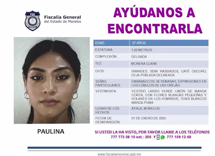 Paulina, de 27 años de edad, fue vista por última vez el primer día de 2025 en ese municipio por lo que la Fiscalía General del Estado de Morelos difundió una ficha de búsqueda para dar con su paradero, especificando que contaba con un periodo de 38 semanas de gestación.