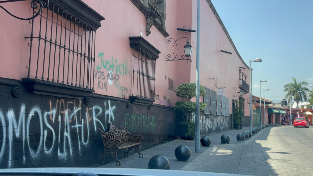 Cuernavaca, Morelos.— La marcha por el Día Internacional de la Mujer realizada este domingo en la capital de Morelos derivó en actos de protesta y daños en el Palacio de Gobierno estatal, donde un grupo de manifestantes realizó pintas, rompió cristales y arrojó objetos contra el inmueble.