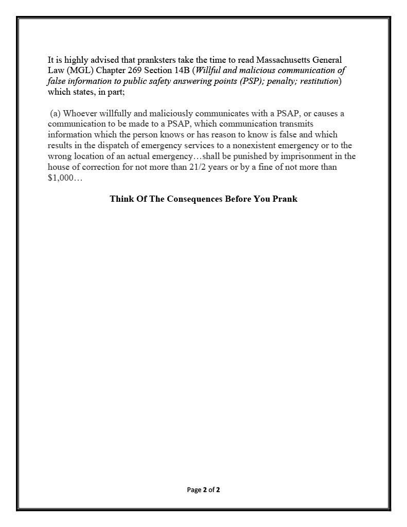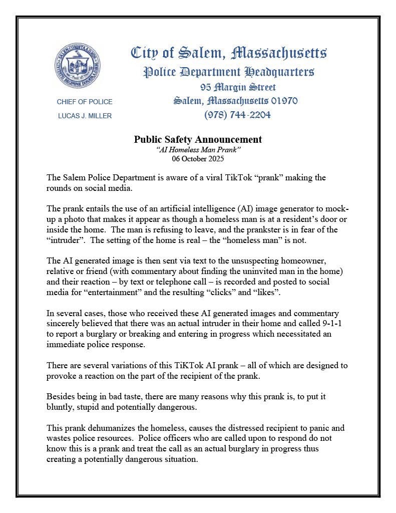 El Departamento de Policía de Salem, Massachusetts, publicó un comunicado condenando la práctica: “Esta broma deshumaniza a las personas sin hogar, genera pánico en quienes la reciben y desperdicia recursos policiales. Los oficiales responden creyendo que se trata de un robo en curso, lo que crea una situación potencialmente peligrosa”.