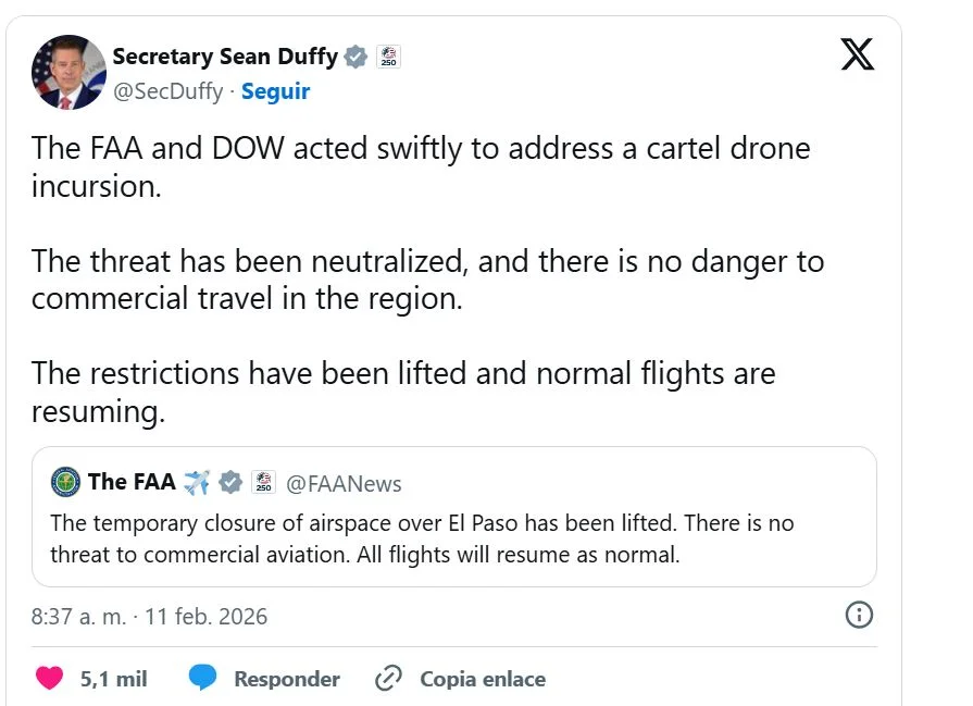 El secretario de Transporte de Estados Unidos, Sean Duffy, informó en su cuenta de X que, tras neutralizar la amenaza, las operaciones fueron reanudadas al determinar que no existía peligro para los vuelos comerciales en la región.