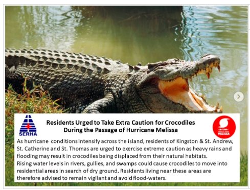 Kingston, Jamaica | 28 de octubre de 2025 — Tras el paso del huracán Melissa, las autoridades de Jamaica emitieron una alerta a la población por la aparición de cocodrilos en zonas residenciales debido al aumento del nivel del agua en ríos, barrancos y pantanos.
