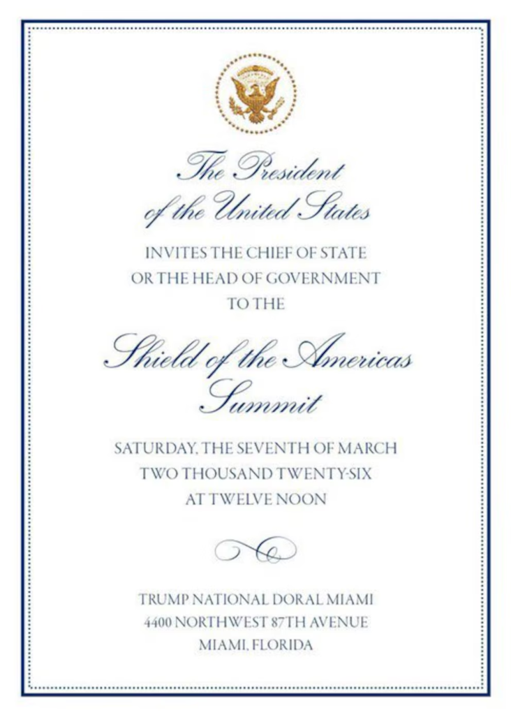 Entre los países convocados se encuentran Argentina, El Salvador, Ecuador, Paraguay y Honduras, cuyos gobiernos han mantenido acercamientos políticos con la administración estadounidense. Entre los mandatarios invitados figuran Javier Milei, presidente de Argentina; Nayib Bukele, de El Salvador, y Daniel Noboa, de Ecuador.