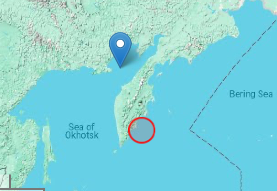 Ubicación del epicentro del sismo de magnitud 7.4 registrado frente a la costa oriental de la península de Kamchatka, Rusia, en el mar de Ojotsk. El evento activó alertas de tsunami que posteriormente fueron canceladas.