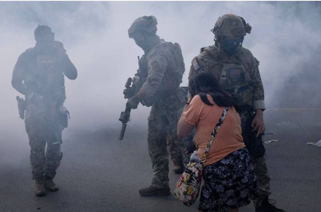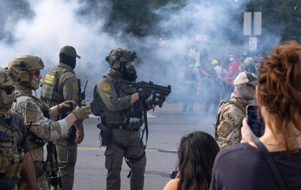 Elementos fuertemente armados resguardan una calle de Chicago entre nubes de gas durante las protestas por el operativo federal. Foto: Meximanco