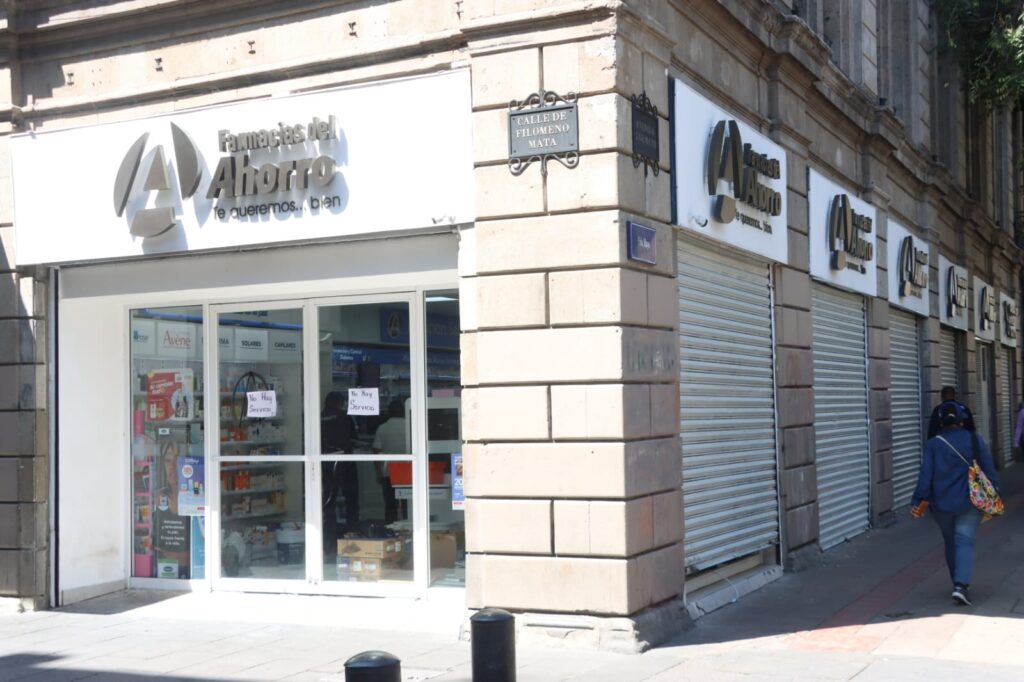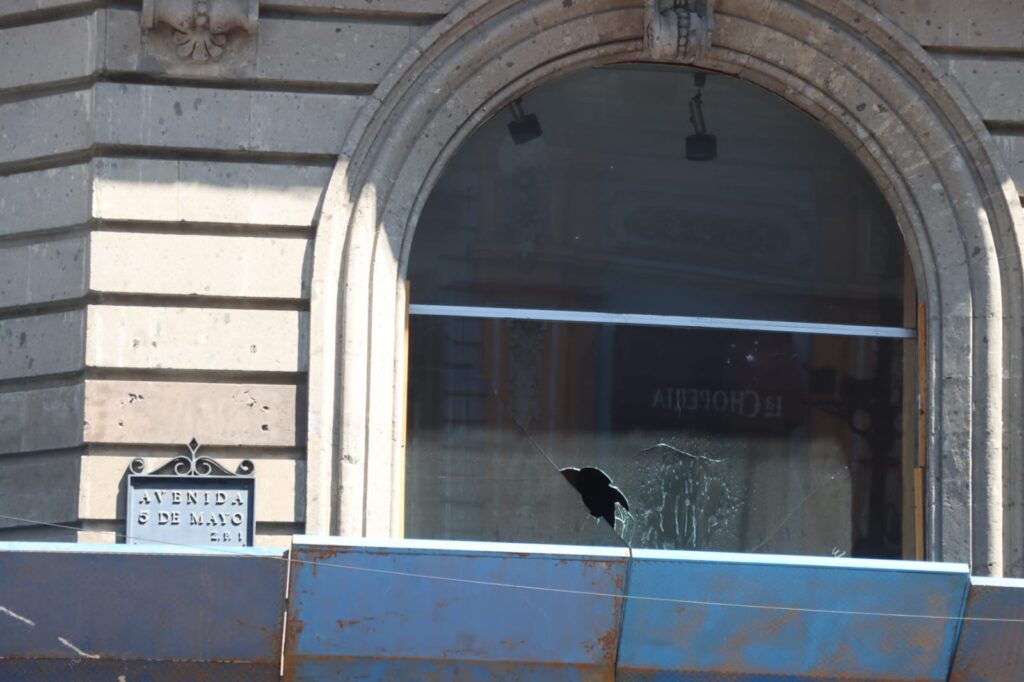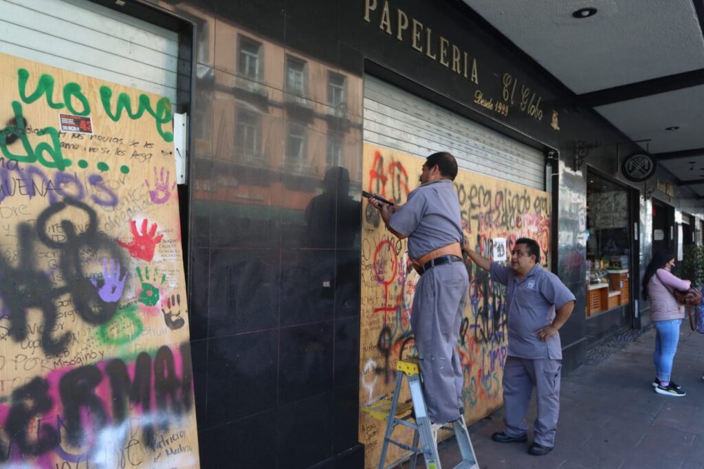 Comercios del Centro Histórico exhiben vidrios rotos y persianas dañadas tras los disturbios del 2 de octubre.