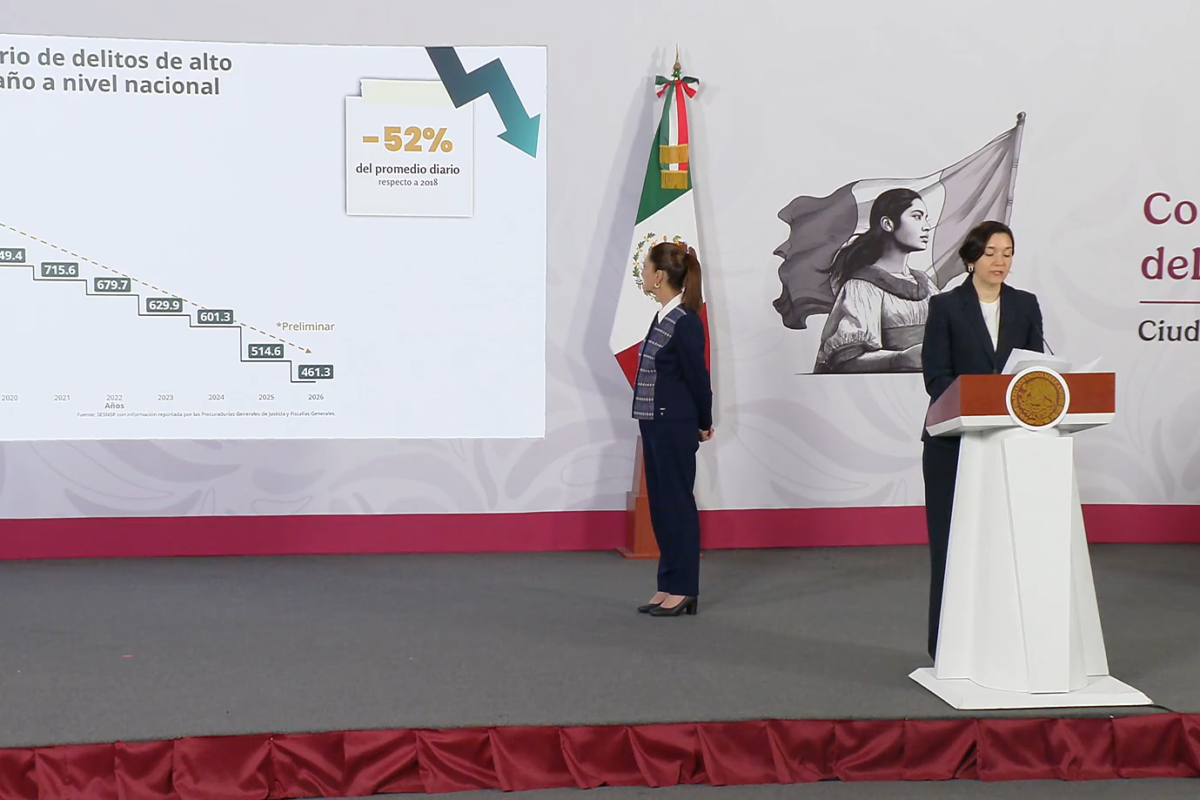 Respecto a delitos de alto impacto, se informó una disminución en feminicidio (14.9%), secuestro (36%) y extorsión (17.7%) desde el inicio del actual gobierno.