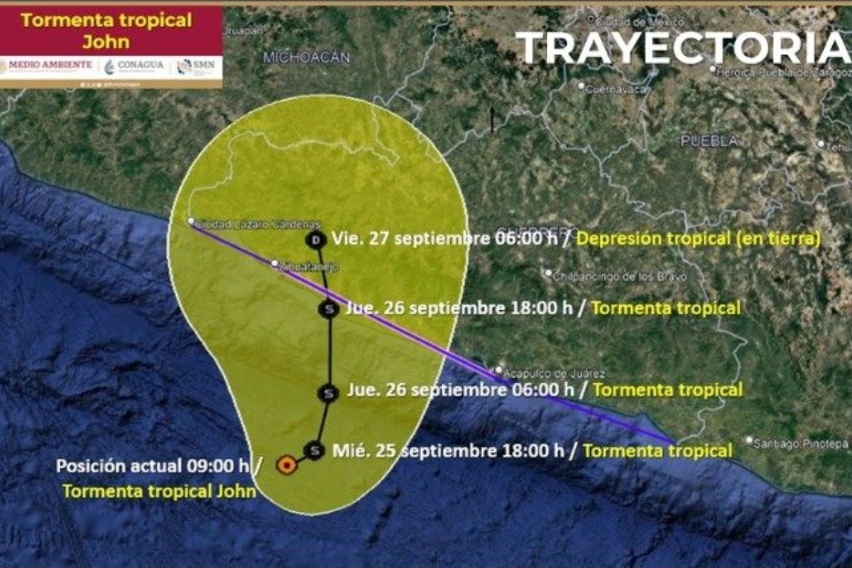 El Servicio Meteorológico Nacional (SMN) ha emitido alertas por efectos de huracán en la zona que abarca desde Acapulco hasta Zihuatanejo, Guerrero, y también por efectos de tormenta tropical entre Punta Maldonado y Lázaro Cárdenas, Michoacán. Se espera que John toque tierra nuevamente en Guerrero el jueves 26 de septiembre, cerca de Zihuatanejo. Posteriormente, el sistema se debilitará gradualmente a depresión tropical mientras avanza por el estado.