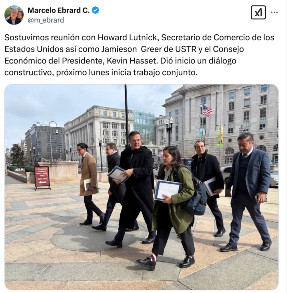 En su cuenta de X (antes Twitter), Ebrard compartió: «Sostuvimos reunión con Howard Lutnick, secretario de Comercio de los Estados Unidos, así como con Jamieson Greer de la USTR y con Kevin Hassett del Consejo Económico del Presidente. Dio inicio un diálogo constructivo; el próximo lunes inicia el trabajo conjunto».