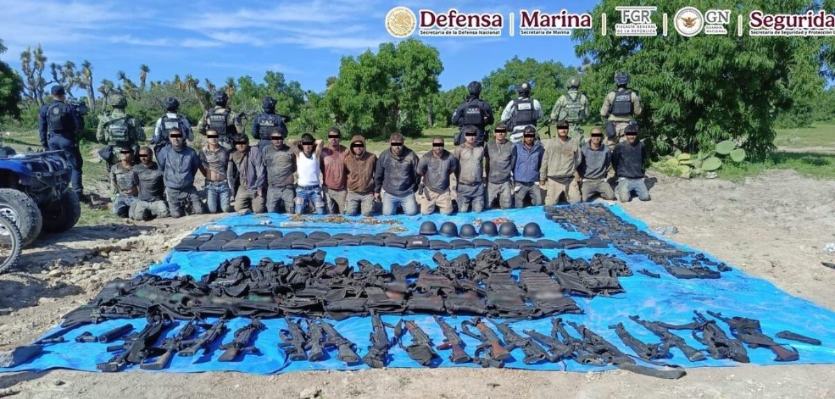 Durante la intervención, se detuvo a 18 personas y se aseguraron 20 armas de fuego, un aditamento lanzagranadas, 28 chalecos tácticos, cascos, cargadores, cartuchos y equipo táctico, además de un kilo de polvo blanco que será analizado. Uno de los detenidos resultó herido y fue trasladado bajo custodia a un hospital.