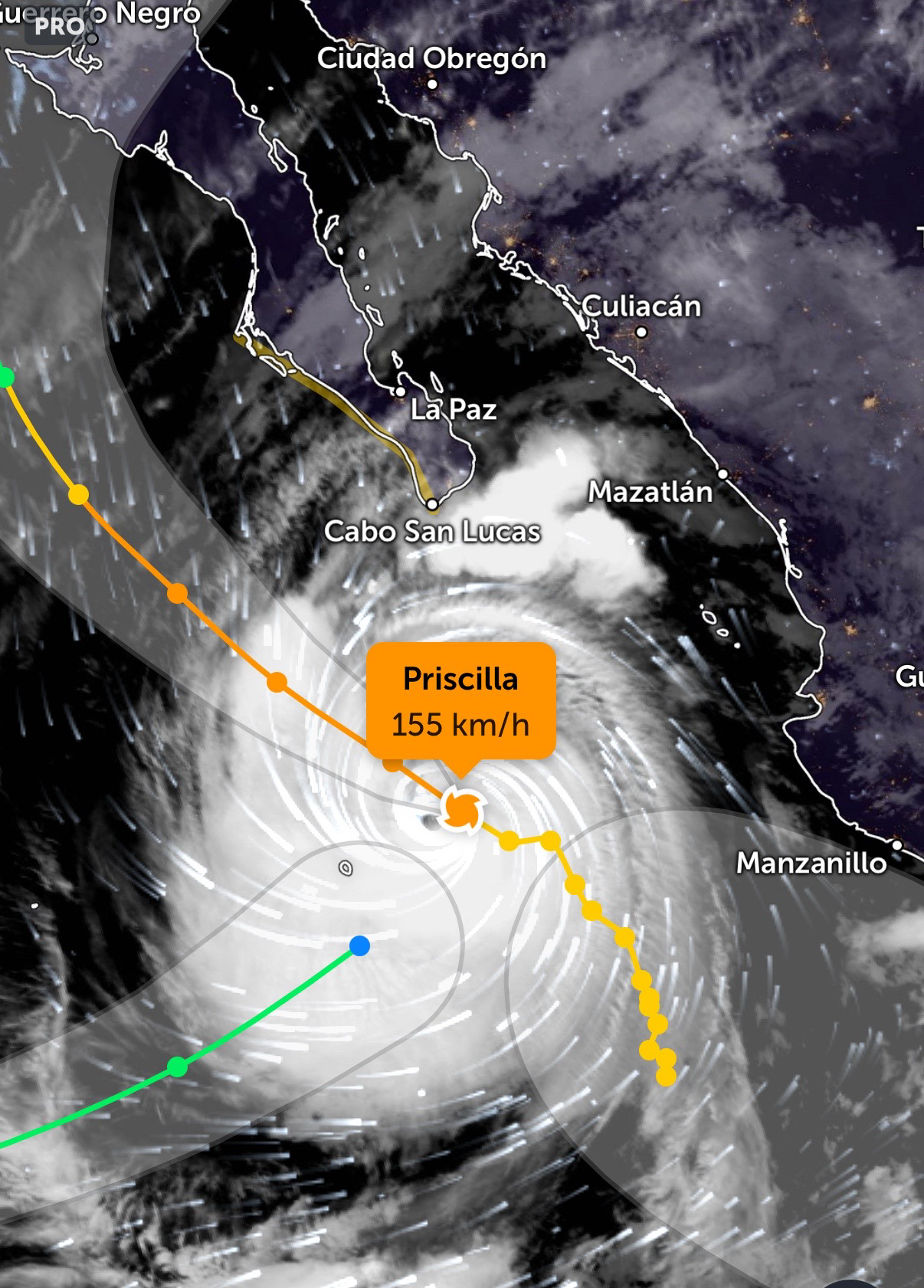 Imagen satelital del huracán Priscilla, que alcanza vientos de 155 km/h mientras avanza por el Pacífico; sus bandas nubosas provocan lluvias intensas y oleaje elevado en el occidente del país.