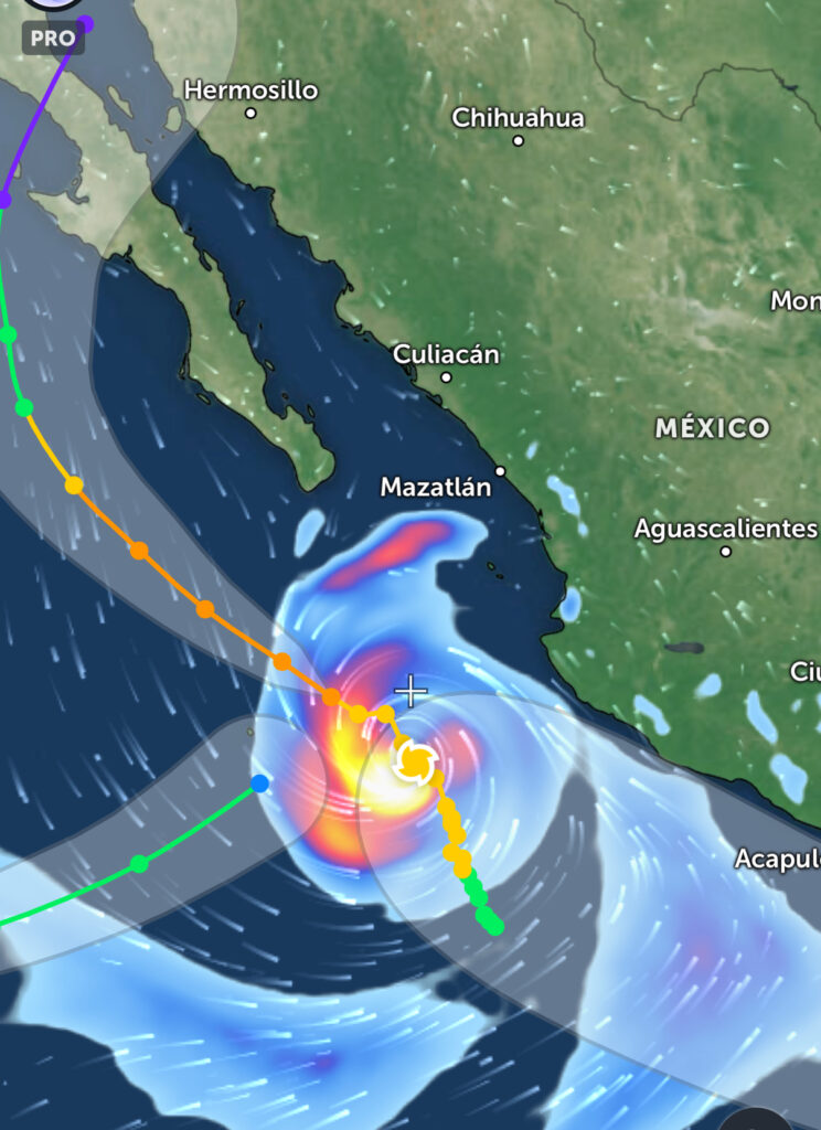 El sistema se ubica a unos 390 kilómetros al sur-suroeste de Cabo Corrientes, Jalisco, con vientos sostenidos de 155 kilómetros por hora y rachas más fuertes, desplazándose hacia el noroeste.