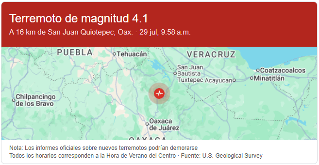 De acuerdo con el SSN, las coordenadas del epicentro corresponden a los 15.181 grados de latitud y -94.728 de longitud. La institución recordó que los datos del sismo son preliminares y podrían ser actualizados conforme avance la evaluación.