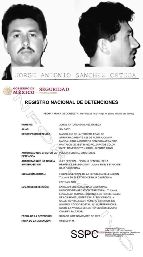 De acuerdo con el Registro Nacional de Detenciones, la captura se realizó a las 16:37 horas en la colonia Los Reyes, en Tijuana, Baja California. La detención estuvo a cargo de elementos ministeriales y fue confirmada por autoridades federales.