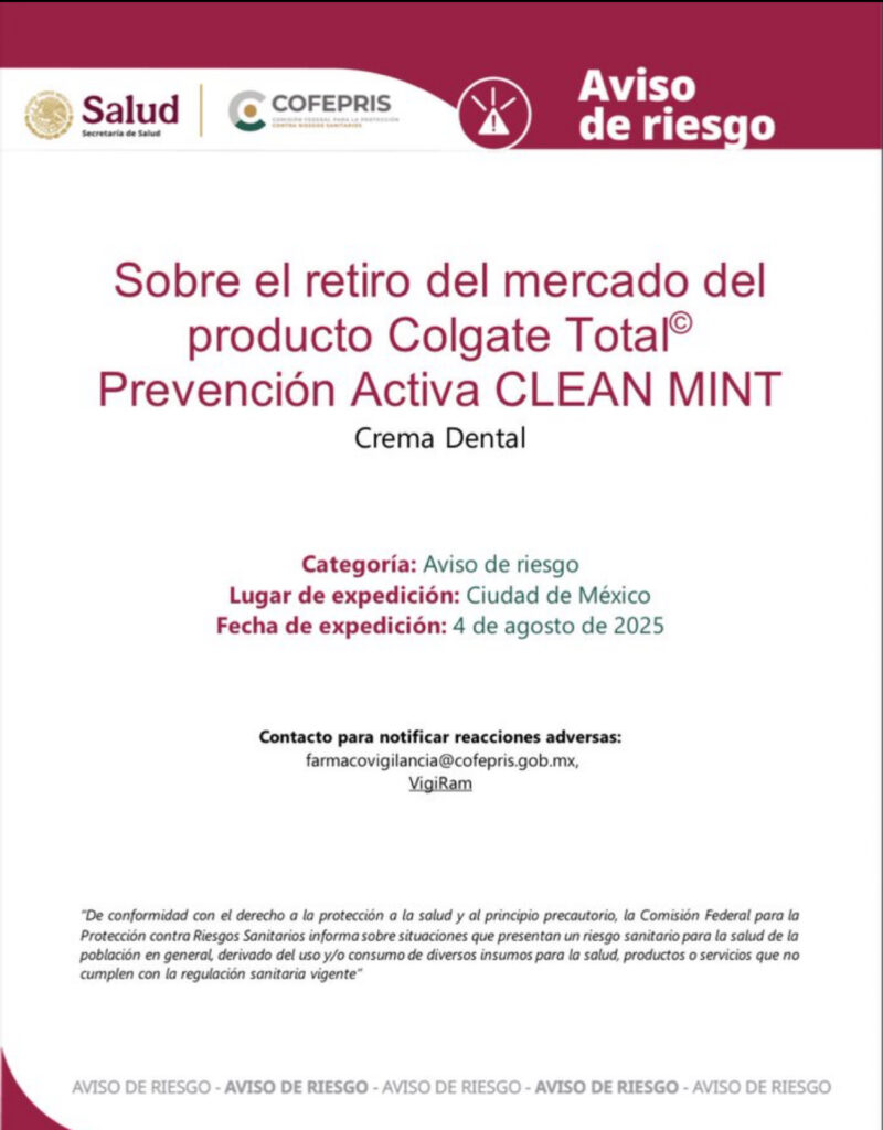 Ciudad de México. La Comisión Federal para la Protección contra Riesgos Sanitarios (Cofepris) emitió un aviso de riesgo y ordenó el retiro inmediato del mercado de la pasta dental Colgate Total Prevención Activa Clean Mint, luego de recibir múltiples reportes de consumidores que presentaron reacciones adversas.